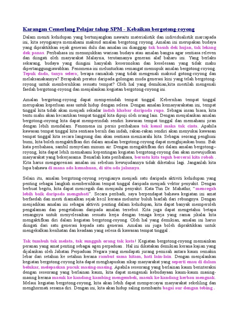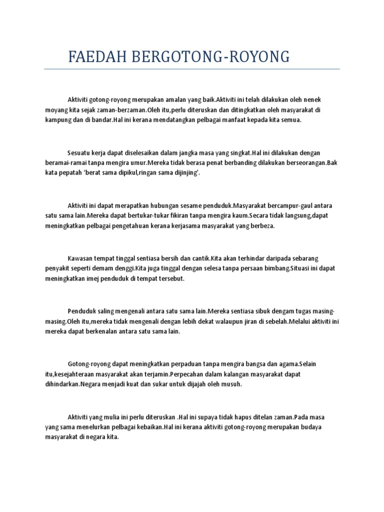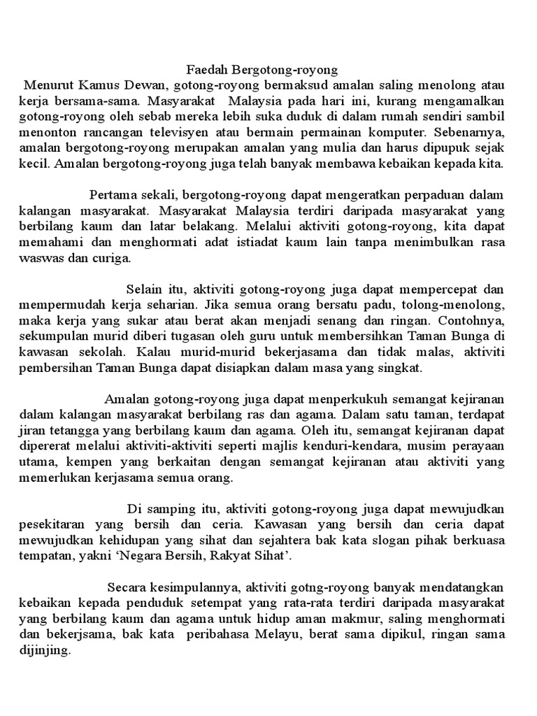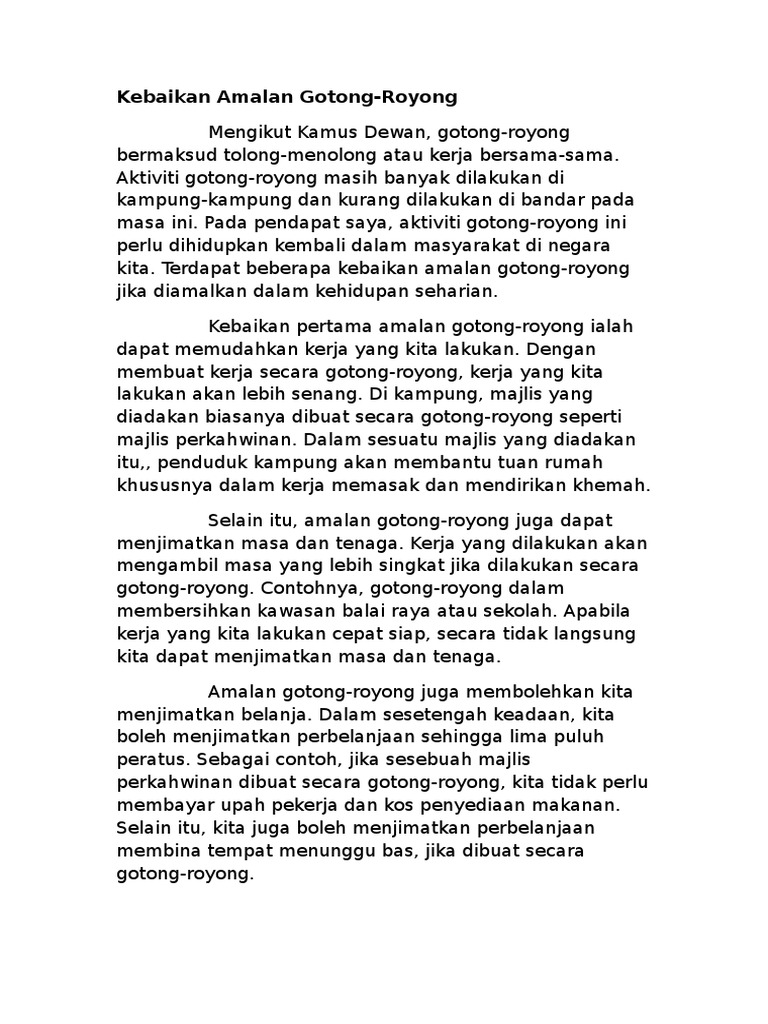 Contoh Karangan Kebaikan Gotong from imgv2-1-f.scribdassets.com Karangan tentang pelancongan di malaysia karangan punca gejala sosial dan peranan ibu bapa karangan tentang cara cara menjaga keselamatan di jalan raya karangan punca berlakunya pencemaran alam sekitar karangan punca pencemaran sungai spm karangan tentang pencemaran alam sekitar spm karangan tentang kepentingan. Sebagai contohnya, jiran tetangga membantu sesebuah keluarga dalam persiapan untuk kenduri kahwin. Amalan ini memberikan satu semangat kepada masyarakat bahawa tugasan itu walau berat pun akan mampu diselesaikan dengan begitu. Secara peribadi, saya berpendapat bahawa kegiatan ini amat berfaedah dan mesti diamalkan sejak kecil kerana meluntur buluh biarlah dari rebungnya. Badan yang sihat juga dapat mengelakkan seseorang tiu terkena penyakit. Kebaikan mengamalkan amalan gotong royong atau bekerjasama ini ialah amalan ini mewujudkan semangat positif antara ahli masyarakat terutama untuk memastikan sesuatu tugasan itu mampu dilaksanakan dengan berkesan. Kesannya , kita dapat menggunakan masa dengan baik. Kesannya, kita akan menjadi warga sekolah yang bertanggungjawab terhadap alam sekitar, masyarakat dan diri sendiri.